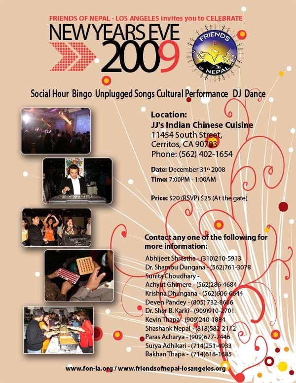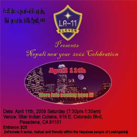 Lets meet people on april 11th saturday 2009 in Los Angeles for celebrating Nepali New Year 2066 BS Info on the flyer.... New Year Event organized by LA 11 players and lets have some good time together. goood environment, Nice place, big banquet hall to that of the size of Basetball court....