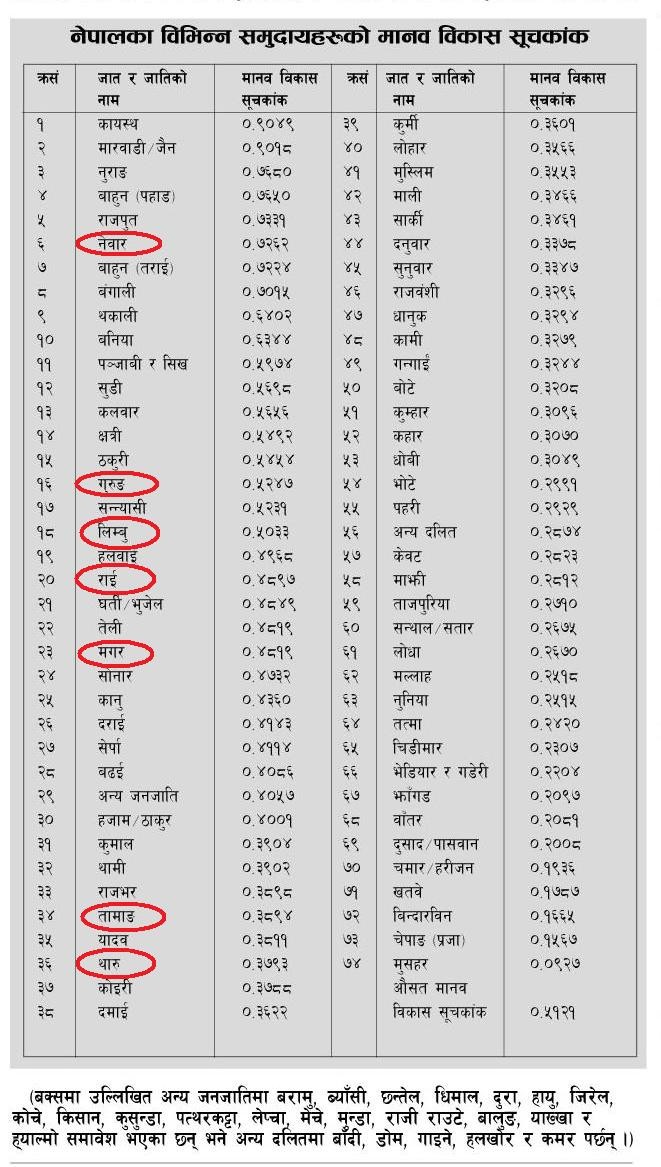 माओवादीद्वारा प्रस्तावित माओवादीले छानेका सात जातीलाई राज्य दिने संघीय मोडेल कती खेलाँचीपूर्ण छ भन्ने कुरा हेर्न तलको जातीय विकास सूचकांक (Human Development Index by ethnicity) को तालिका हेर्दा हुन्छ ।