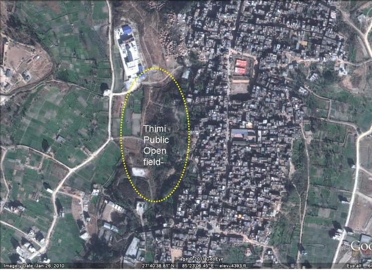 In 1994, I had visited outskirts (similar areas you have highlighted in the above picture) of Sanagau, Thimi, Panga and Lele. In the picture, the white block right north of the highlighted area is a newly constructed hospital. It was also a public area called Mye-Dofo when I visited the area. My visit was a part of Dutch funded project studying possibility of recycling solid waste to manufacture high-quality manure for organic farming. Theoritically, the human/animal waste are valuable collectible for sustainable solid waste management. We did a survey on how much collectible waste is dumped there on regular basis. The good quality waste does not stink, that is the principal of waste-collection and recycle business. The plan was to systematically collect the waste and establish an organic manure manufacturing plant. This project was abandoned because we were unable to ensure constant supply of good quality human/animal waste convertible to organic manure due to rapid increase of domestic toilet construction, which would make the plan economically unfeasible. That conclusion was found true in 2005, as there were more than 70% houses equipped with in-house toilets, and by now, almost all houses have one. The toilets are mostly connected directly to sewere, without separating black, grey and white waste that are not useful for the economically attractive organic manure production.
