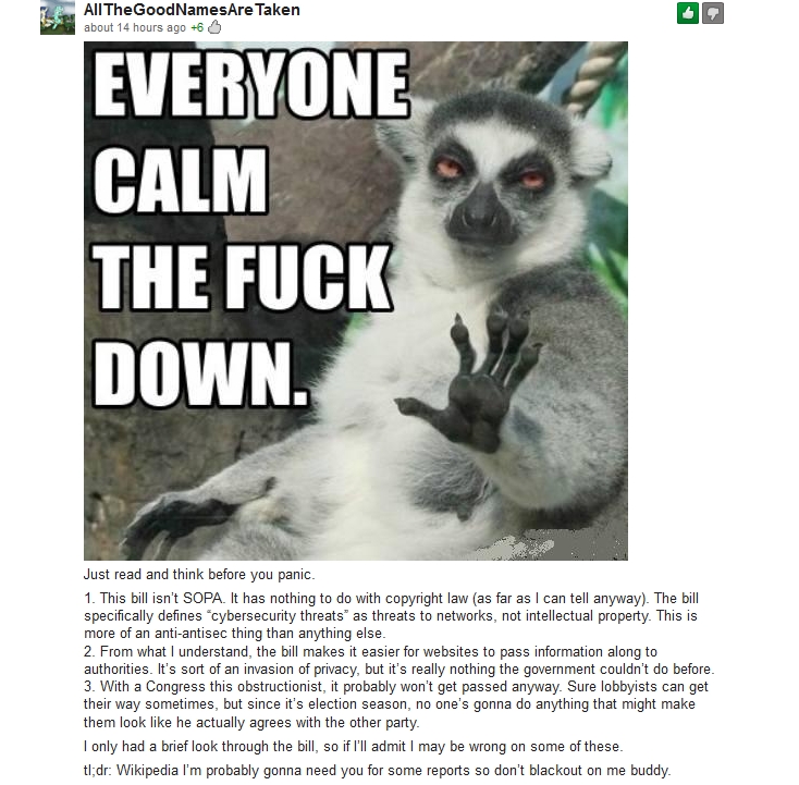 okhay i know how the history of internet! u might wanna go beyond tim berner lee!! :P !! CISPA is not only abt the copyright infringement!!! its about the companies handing over the information to the government officials. its about how the government uses the data!!! i really don't like the idea of government having to know all the stuffs we do ..i don't like the idea of being monitored about all my browsing activities and what i post on forums!!!! and abt your copyright infringement!! yes you will be fined for downloading those contents!!! i know people being fined for downloading "hurt locker" movie. YES i am aware of that!! i have heard about the testimony of AT&T engineer who said that the whole backbone of the internet was tapped. Facebook & other companies share our information too, YES I AM AWARE OF THAT TOO!!! i dont use my real name in facebook!!! i don't put obnoxious pictures or anything that could be used against me !!! REASON ? i guess you know it!!! HERE's the thing!!!its about right to freedom and privacy!! i know our privacy has been invaded since LONG TIME !!! but does that mean we have to support this bill!! maybe people can show there dissatisfaction against the government!!! and what irks me that these leaders have not realized that you can't control the internet!!! think of how this bill can be disastrous to the people!!! and yes about "KILL Switch" i know abt that!! think what will happen to the infrastructure of this country!!! i hope they dare to do it!!:P Some muslim terrorists were responsible for 9/11. so do we go on to label every muslims as terrorist? or doe we find ways to secure the facilities? just coz some hackers are hacking and stealing information, do we look for our faults on system or we go on to impose bills like CISPA so we can monitor the shit out of people!!! Remmber SONY pictures ? even being a tech company they were storing passwords in plain text!!! So do we really blame hackers or the organization for putting up a shitty security!!! there are many tools used in hacking...can't believe so many websites are vulnerable of simple sql injection!!!!! AND THEN THESE STUPID ORGANIZATION WANTS HARDER LAW ON HACKING!!!! bro if u are not that concerned about privacy!! let me remote login in to ur comp!! :D i hope u wont mind letting me see what u do !! since u are a good man who does no harm!!! and abt torrent and seeds!! i do it all time!! i am not proud of it!! but i cant help it!! :D Sharing is caring!!!! u know what wud be fun!! those porn sites releasing the porn search of senators!!! O.o for me Obama saying he would veto means the bill is still not good enough!!! he wants another bill with harder laws!! :P here's an interesting post!! i linked to washington post since u dont like GIZ http://www.washingtonpost.com/blogs/compost/post/bad-cispa-and-the-accidental-overshare/2012/04/27/gIQA15wylT_blog.html