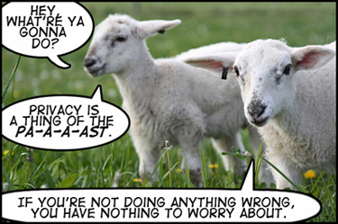 @bittertruth "if you're not doing anything wrong, you have nothing to worry about"-- i just dont get it... -Suppose you walk into a grocery store and the owner keeps following you just coz he thinks that you might be trying to steal a candy even though you are a legit customer. how would that make you feel ? what if he says, "i don't think you are going to steal but you know just making sure" ? i bet you know how indians feel when they see a black guy in store!! - how about someone following you all the time with a knife and he says, "hey i am not going to do you any harm!!!". what wud be ur response?!!! this is a wrong approach buddy!!! and abt the image: looks like that guy didn't know how to view wikipedia on the blackout!!! and about the pic above!! here's what i think!! https://www.youtube.com/watch?v=aIrhVo1WA78 TL;DR: bittertruth loves sheeps!!!!