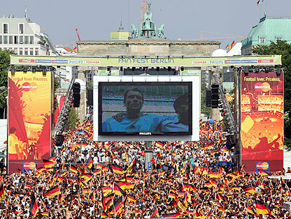 fan fest in berlin .lehmann on the screen singing national anthem.