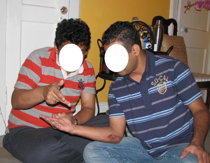 हैन यो दोस्रो फुटोमा त्यो हात देखाइ रहेको मान्छे को घाउ के भएर हो,