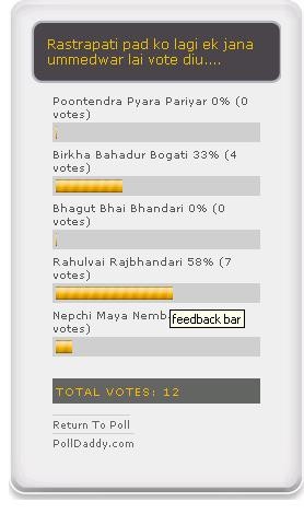 हाल्न त हाल्ने, कसरी हाल्ने हो भोट? आफुलाई त {parmanent head damage } लागेर हो कि केही कुरो को मेसो पाउन्न आजकाल अनि जिम्माल बा किन कुर्लेका नि। राष्ट्रपतिमा नि नाम त देख्छु त। राजा पनि आँफै, राष्ट्रपती नि आँफै हुने सुर छ कि कसो।