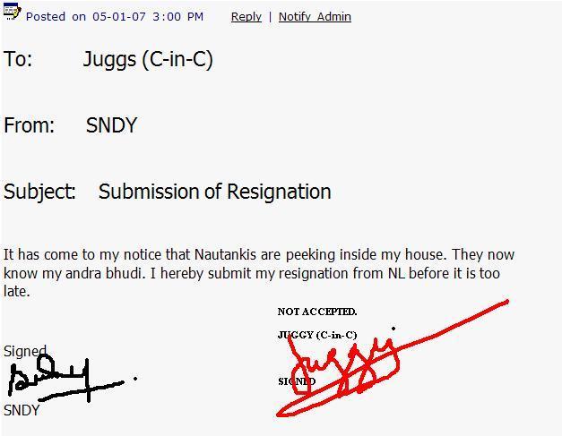 To: Juggs (C-in-C) From: SNDY Subject: Submission of Resignation It has come to my notice that Nautankis are peeking inside my house. They now know my andra bhudi. I hereby submit my resignation from NL before it is too late. Signed SNDY