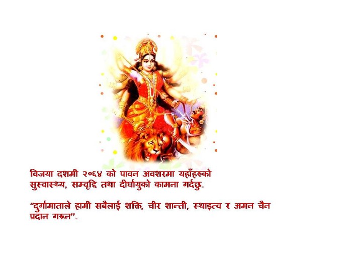 दशैंको आशिष टिका होस् निधार मा जमरा होस् कान मा सुख होस् परिवार मा शान्ती होस् देश मा दसैं मा खुशी को बास होस् सत्रु को नाश होस् हरेक परिक्षा मा पास होस् सुन चांदी को रास होस् हात मा २१ पत्ति को तास होस् र घर मा मासु र बियर को बास होस् पुरा होस् मनोकामना यही छ मेरो विजय दशमी २०६४ को शुभकामना