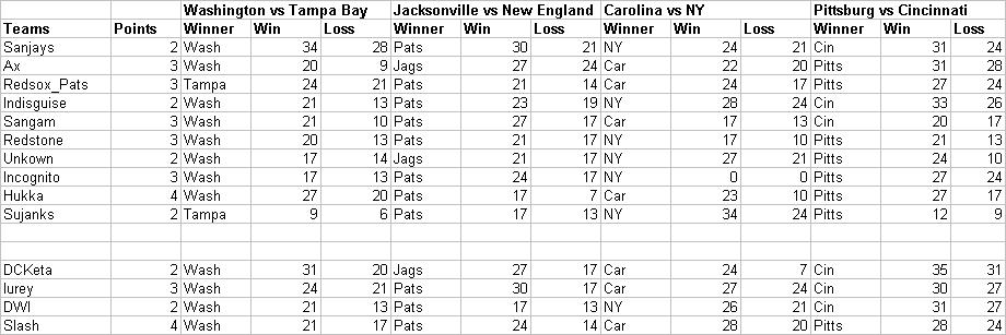 Here's mine: Denver vs NE ................ NE 31-27 Indy vs Pitts................... Indy 24-21 Chicago vs Carolina ......... Panthers 17-10 Seattle vs Washington ..... Hawks 21-14