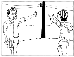 गरिबलाई गरिबको मयाँ धनीलाई धनको मयाँ भन्ते दमै राजुका बाले। मलै नि गरिबकै मयाँ लाउच। हेर यो धागो! चुचुचू! न डल्ली फुपु छन् न माष्टर्नी न रुइनु न फल्याप फुलुप न म्याउटिस रोज। के हो यस्तो सुकेको धागो? ला राउनितिका गफ अरम्। आँफु त जम्मैळाई समेलेर तह लाम्नका खाँतिर भे नि तानासाही चाहिन्छ भनेर हिँडियो। लौ जा! छाप के मा? बन्दुकमा! लौ जा!