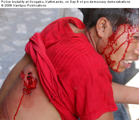 Police open fire at demonstrators in Gonganu, over a dozen critically injured More than a dozen protesters were injured when security personnel opened fire at a demonstration in Gongabu in Kathmandu Tuesday evening. TV footages showed several injured demonstrators being rushed to hospital as violent clashes between the police and the protesters went on. Red Cross officials, some foreign volunteers and police personnel carried the inured persons to police vans and other vehicles to be rushed to hospital. According to human rights monitors present on the scene, more than a dozen agitators were shot by the riot police and the Armed Police Force (APF) officials as angry demonstrators threw stones at the residence of police AIG Roop Safar Moktan at Gongabu after unidentified persons reportedly opened fire at the crowd from inside the house. APF Senior Superintendent Madhav Thapa who was leading the security forces refused to order his men to halt fire despite several requests after a number of protesters were shot at, the rights activists said. Several rights activists and journalists were also injured as police indiscriminately charged batons at the crowd while dozens others were arrested from the protest that started soon after the daytime curfew ended at 5:00 p.m. The condition of a number of persons who have been undergoing treatment at Tribhuvan University Teaching Hospital is said to be critical. nepalnews.com mk Apr 11 06
