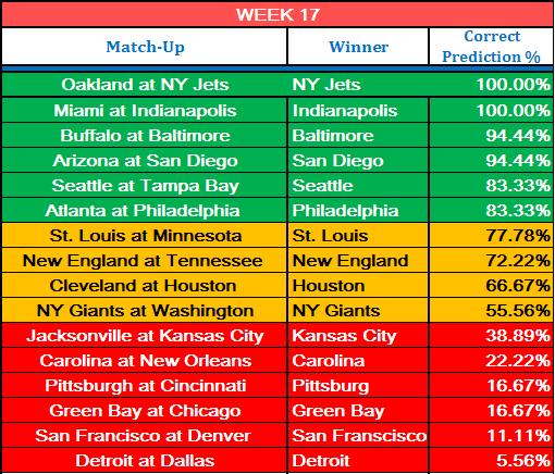 And our predictions looked lke this for Week 17: