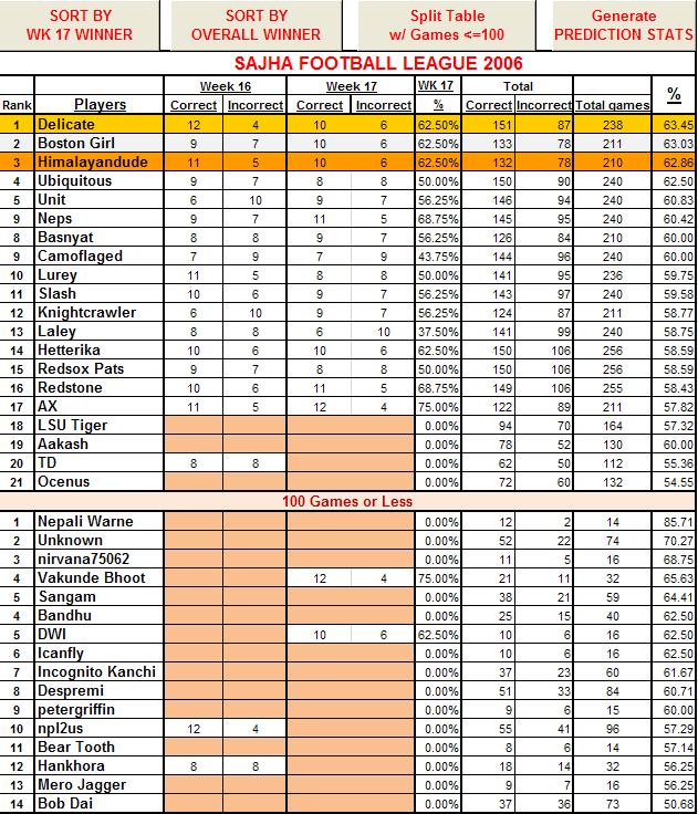 Thanks Knight for the scoreboard! I can't believe Delicate outran me by decimals..hence, landing myself on second position. I know you will be more than happy to trade places with me, but still.... And why would you skip my name and score and go on to highlight himlayandude?? We both have the same score for this week, and his overall score is below mine...ummm..just wondering. You did a great job this season!! You are like Jeff Garcia carrying on the legacy of McNabb (aka. Slash).