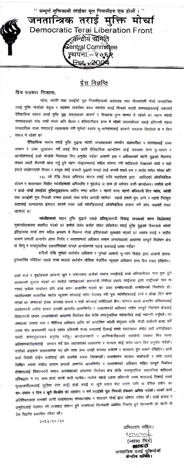 तराई मुक्तिमोर्चाको बक्तब्य: मेरो संसारबाट . http://www.mysansar.com/?p=1273 .
