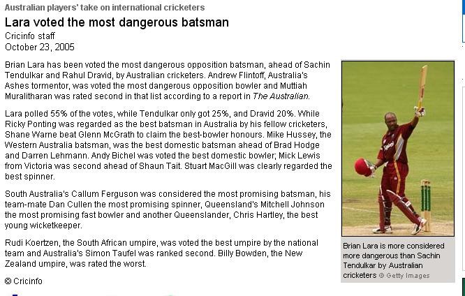 Maverick you are probably first person to said Lara bats Ugly. So much for your analysis. Unfortunatly the 241* you are talking about tendulkar isnt a match winning innings. Infact he got more criticisms from indian media after that innings because people said tendulkar slowed down so much that it put everybody to sleep. Tendulkar winning innings . Sorry guys show me a match wining innings. One i can remember is 155* against Australia in Chennai. But what about the bowling attack of Australia. Adam dale, kasprowickz,, Gavin robertson and injured shane warne. no mcgrath, no fleming, no paul riffel, no Gillespie. Weakest aussie attack for a decade. And maverick every batsman have their weakness. If you look average of great Garfield sobers against newzealand it is less about 20. Does that make him less batsman. Quagmire. Tendulkar dominance against bowlers.????? You must be living on 90's. He have failed to consistently dominate over the years.