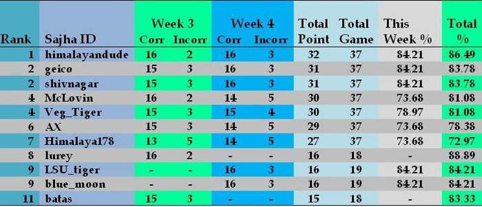 No. 3 Georgia at Arizona State ----> Georgia No. 4 Florida at Tennessee ----> Florida Buffalo at No. 5 Missouri ----> Missouri No. 6 LSU at No. 10 Auburn ----> LSU Rice at No. 7 Texas ----> Texas No. 9 Alabama at Arkansas ----> Bama Massachusetts at No. 11 Texas Tech ----> Texas Tech No. 12 South Florida at Florida International ----> South Florida Troy at No. 13 Ohio State ----> Ohio State Wyoming at No. 14 Brigham Young ----> BYU No. 15 East Carolina at North Carolina State ----> ECU Temple at No. 16 Penn State ----> Penn State Boise State at No. 17 Oregon ----> Oregon No. 18 Wake Forest at No. 24 Florida State ----> Wake Forest Sam Houston State at No. 19 Kansas ----> Kansas No. 20 Utah at Air Force ----> Utah No. 21 West Virginia at Colorado ----> WVU South Carolina State at No. 23 Clemson ----> Clemson No. 25 Fresno State at Toledo ----> Fresno State