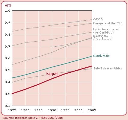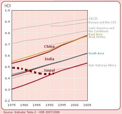 Quote from the website,"The human development index trends tell an important story in that aspect. Since the mid-1970s almost all regions have been progressively increasing their HDI score (Figure 2). East Asia and South Asia have accelerated progress since 1990." So Its not just Nepal. Which means that Girija and company were doing fine with the monarchy in place. Which also contradicts your republican movements Gyaney chor desh chod naraa( I am not a gyaney fan).