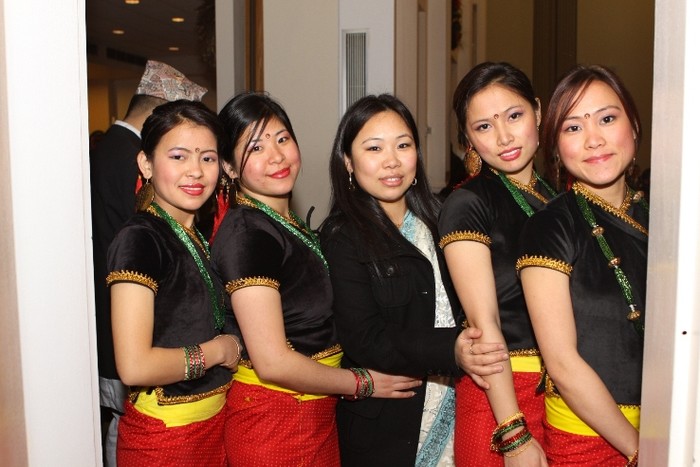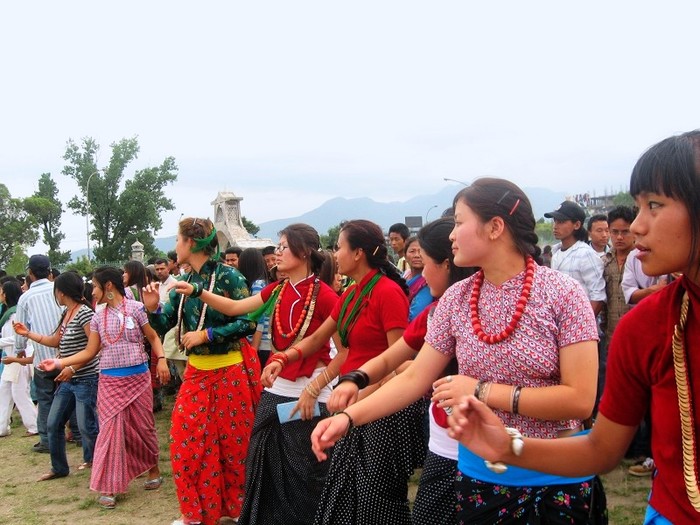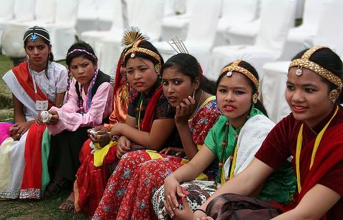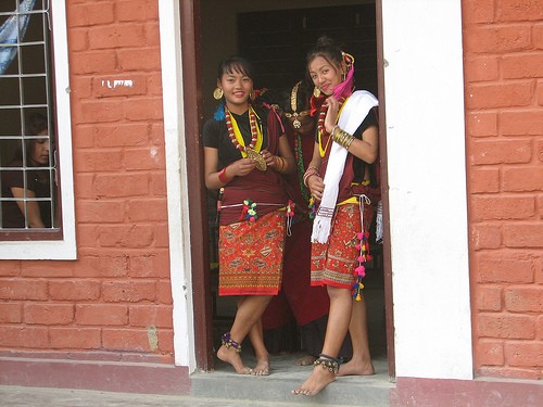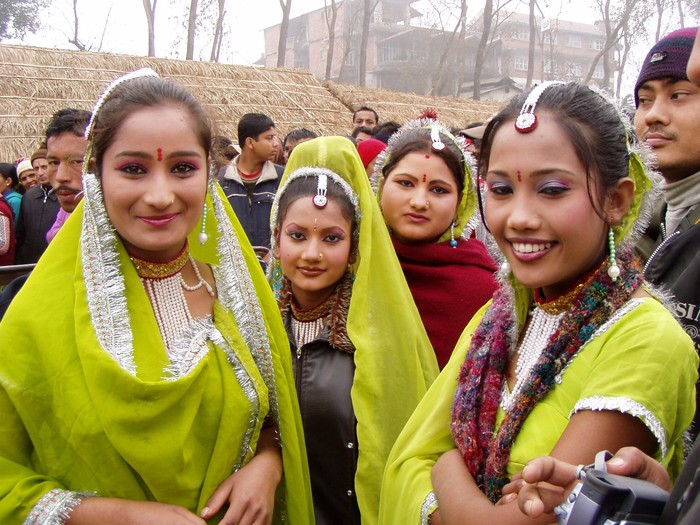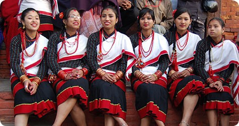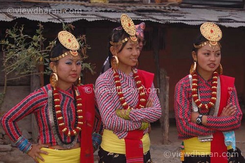 Lovely Rajbanshis in their beautiful costume. Rajbanshis live in the Nepal-India borderlands of the districts of Jhapa and Morang of east Nepal. Anthropologists opine that they are the kiths and kin of the peripheral Koch people of the adjacent states of West Bengal and Asom (Assam) in India. Though having Mongoloid features - they consider themselves as a branch of the Kirants - their language is akin to Bengali and Assamese. They wear clothes conforming to their climate and weather. They worship Thakur Brahmani and also practice shamanism. Consumption of alcohol is a must for worshiping the gods. They play with mud and water during their major festivals. The groom's side makes monetary payment to the bride's family during their marriage. This custom also prevails among some other ethnic groups of Nepal. Their principal occupation is agriculture. Rajbanshis were the indigenous people of Jhapa and Morang before the hill migrants of Nepal overwhelmed them. Most of the Rajbanshis bury their dead but now-a-days some of them have adopted cremation formalities. According to Census 2001, their population is 95,812. The name Rajbanshi was given after AD1515. The original tribal name of Rajbanshis is Koch or Koche. Worshippers of nature and followers of shamanistic religion these indigenous Koch people have changed their names to Rajbhanshi after coming into contact with Hindus (Sharma, BS2045; Upadhyaya, BS2051-052). They have a lifted bone over their throat a little higher than the average height. The structure of their eyes and forehead, etc is like those of a mix of Aryan-Mongloid, Austric, Negrito, Dravidian. A mix of the culture of worshippping nature and Hindu culture however seems to have developed among the Rajbanshis of Nepal.