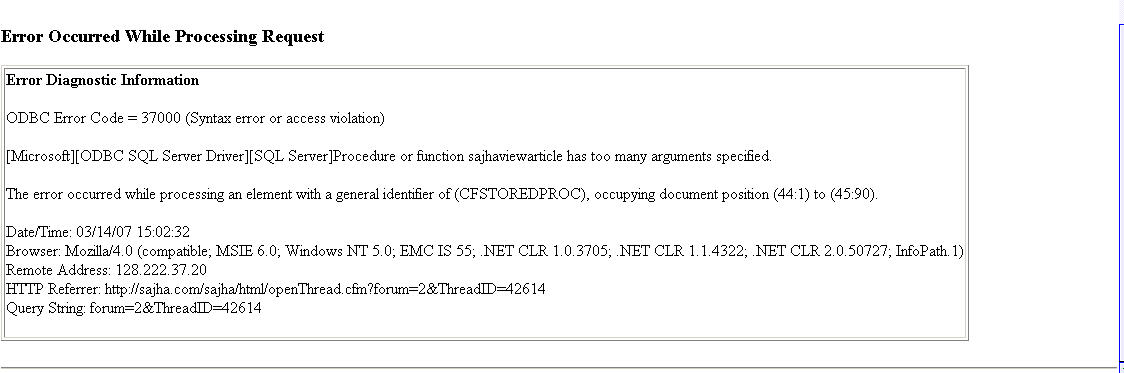 SNDY - Yes, it's a nice brand, no? What do you think about it? Beat me - be my guest! I want you to --LOL! BTW, are you able to see all replies to this thread? I get following error when I try to. I wonder if it has anything to do with the thread exceeding 600 posts. San dai, any ideas? Error Occurred While Processing Request Error Diagnostic Information ODBC Error Code = 37000 (Syntax error or access violation) [Microsoft][ODBC SQL Server Driver][SQL Server]Procedure or function sajhaviewarticle has too many arguments specified. The error occurred while processing an element with a general identifier of (CFSTOREDPROC), occupying document position (44:1) to (45:90).