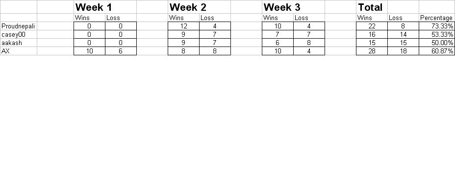 Did you guys saw the shoot out between the Favre and P. Manning??? That was an awesome game. Trick play from Tuna's book was good last nite . I think that play won him the game. ******************************* rameshbabu, dunno where did you get 13-1 for week 2. For week 3, you were pathetic with 42.86% (6-8) Please don't spoil this thread. Peace Out
