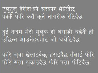 Sitara, Arko truti sudhar. Maile lekhna pugechhu, 'Besides it's maqta [ matla]very much resonates what your musing was all about'. In retrospect, it is not only way too exaggerated but also sounds as an arrogant assertion. In no way, this tiny couplet summarizes all the thoughts you have expressed in your musings. However, a point to remember about ghazal is that, itýs couplets, by their very nature of compactness, are granted to be liberally interpreted, particularly the symbols and metaphors used. In the matla above , the meaning of 'sarakar' is not limited to His Majestyýs Government, but all authorities, political or moral, all stakeholders and every person and institution who has power to influence. With this interpretation, it does capture some of the messages from your musings. And thank you for your 'Wah Wah'. Nikorsi Virginia ma hune Mushai'ra mai aayera 'shubhanallah' pani thapidine ho ki ?