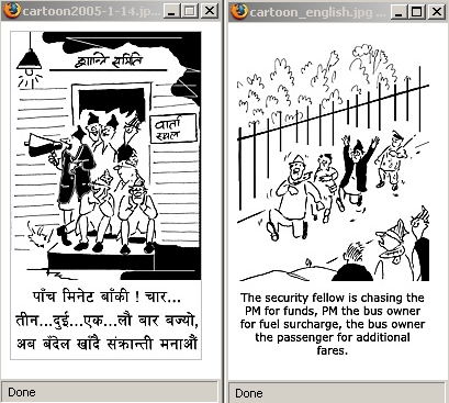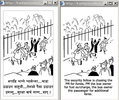 This time there are two different cartoons (nepali and english), however, the english one is same as the previous day's. I wonder there must have been the translated version (from nepali to english) of published in kathmandu post. But, kantipur publication is not putting that one here in Kantipuronline, perhaps thinking that they can shut off the criticisms.