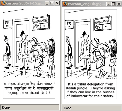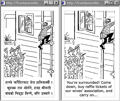Good answer prem dai. There are certain words in Nepali and Hindi as well those are used in english these days like 'bandh' and 'lathi charge' etc. Similarly there are thet english which dont have nepali translation. Well, Kantipur guys will never change prem dai. They should do one thing EITHER PUBLISH CARTOON IN NEPALI OR IN ENGLISH, NOT BOTH. what do you say?