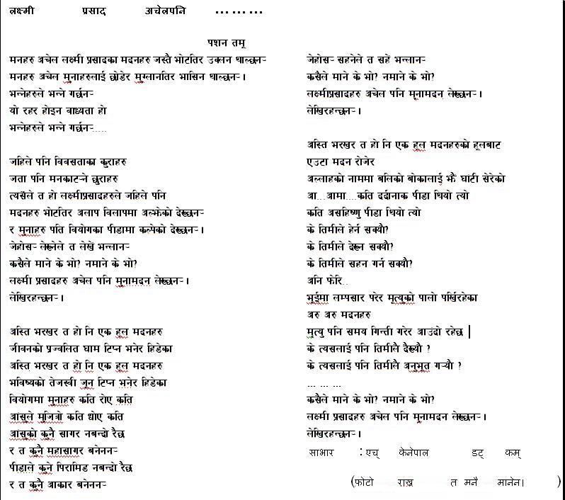 'Aanshu le kunai sagar nabando raichha Pida le kunai pyramid nabando raichha' Akatya satya ehi ho. Ani kina eha kebal Laxmi Prasad haru ko matrai veed lagne garchha. Sabi Muna ra Madan ka aankha bata bidaarak bichhod ka aanshu matra bagaune koshish garchhan. Haamile pani Mesopotamia ka daas harule jastai pyramid banaune prayash kina nagareko? Pyramid ekdin ma baneko haina sathi. Hajarau daas harule barshau lagaera banaeka hun pyramid haru. Euta dhunga bokera pyramid banauna suru garieko thiyo. Suruwat euta ikaai(unit) bata hunchha. Kina sabai sadhai Laxmi Prasad matra banna khojne??? He he he Re Kya. Kaag karai rahanchha Pina Sukdai Garchha. Nepaliharuko durbhagya.