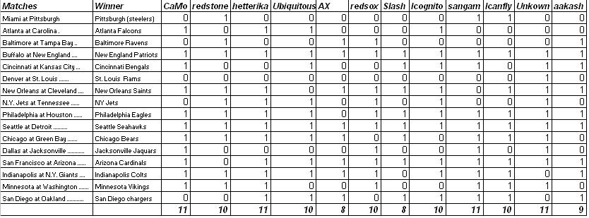 Good to be back in Sajha and glad to see u guys in 2006 Football Pool!!! Atlanta at Carolina .......................... Carolina Baltimore at Tampa Bay .......................... baltimore Buffalo at New England ..........................New England Cincinnati at Kansas City .......................... Bengals Denver at St. Louis ..................................Broncos New Orleans at Cleveland .......................... New Orleans Saints N.Y. Jets at Tennessee ..........................Tennessee Titans Philadelphia at Houston ..........................Philadelhia Eagles Seattle at Detroit .......................... Seawhawks Chicago at Green Bay ..........................Packers Dallas at Jacksonville .......................... Cowboys San Francisco at Arizona .......................... Cardinals Indianapolis at N.Y. Giants .......................... Colts Minnesota at Washington .......................... Redskins San Diego at Oakland .......................... San Diego
