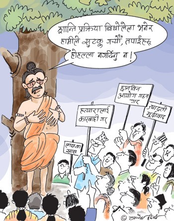 People should continue their andolan, and don't let Maoist form the govt that easily, i.e. without changing the 2/3rd requirement to simple majority. They should be given the govt., and we should watch. We should see their miserable performance in a matter of months. Their government will fall because of their own reason. We will see more YCL/PLA/ Maoists related murders intra and inter party people. Then people will rise. Gyanendra was brought down just by the death of 20 people, how a party responsible for 15,000 people's death gets the Bagdor of the government. People were tired, and said try it with 35% quota. Get a feeling.