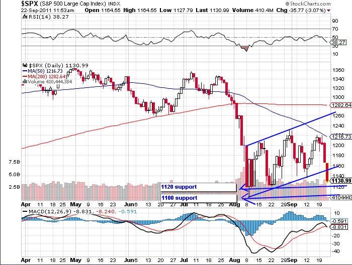CNBC is hollering about these support levels all morning...1120 and 1100 . It may bounce or might not, depends on how impressive the bounce is " I am just reiterating what CNBC is saying...The bearflag is playing out ...it just amazes me when the news just matches the chartpatterns to play out .....its like the chicken and the egg ...which came first