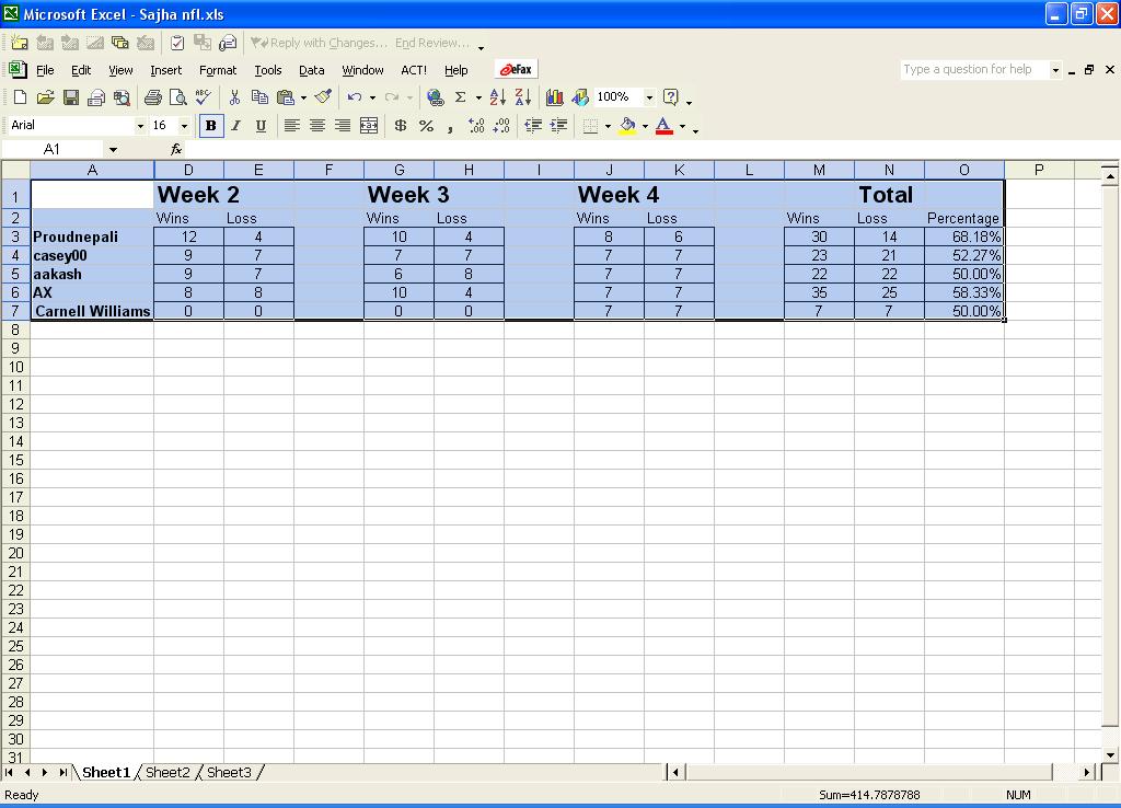 AX bro... I was waiting for that SPreadsheet from you........ I knew the chiefs were not gonna lose 4 in a row. despite being a very good defensive team, I still believe the RAvenS are one of the most overrated team. YOu keep the same personnels over the years and you keep on throwing the same plays... and over the same years the COACHES in the NFL will make adjustments. (We all know the fate of the BUCCAIners after their Superbowl win season) It doesn't take a lot of plays to win a Ball game in NFL. J. Lewis was supposed to run for over 150 yards, guessed what happened?? Priest Holmes on the otherhand ran for over 120 yards. Ravens are a good defensive football team (Offensively sound as well with that running game) but not good enough to win games in playoffs. people think COlts are the best football team.... we beat them already. Panthers are one the most disappointing teams in the NFL. Delhomme is supposed to be better. THeir defense is supposed to be almost like the same of last year if not better. I know they have some injuries and some off-season trade but hell they are a defending NFL champions. Wel.... again the Buccainers issue. THe fALcons are the most improved team in the league as far as season 2004 goes. Coach Mora had found a way to mix the plays and the talents of that rooster. Mike Vick hasn't produced anything (int terms of numbers) yet but if he deos, Falcons can be injurious. Anyways, I will have my picks by Saturday. AX Bro.. the stats.. sheet GO pats go. Jai Nepal