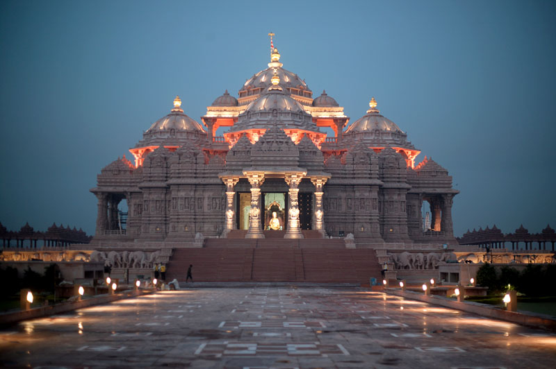 Monument of Akshardham The Akshardham monument, built without steel, is entirely composed of sandstone and marble. It consists of 234 ornately carved pillars, 9 ornate domes, 20 quadrangled shikhars, a spectacular Gajendra Pith (plinth of stone elephants) and 20,000 murtis and statues of India's great sadhus, devotees, acharyas and divine personalities. The monument is a fusion of several architectural styles of pink stone and pure white marble. Pink stone symbolizes bhakti (devotion) in eternal bloom and white marble of absolute purity and eternal peace. The monument was built after over 300 million man hours of services rendered by 11,000 volunteers, sadhus and artisans. It is the one of the wonders of the modern world, and the wonders of modern India.