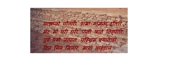 नबोलाईदीनु रे उस्लाई, भन्छे आउन्न रे बिर्सुला रे तर मैले भन्छे, फेरी उदास हुन्छे घर त उस्को बाटैमा पर्छ मेरो, तर नहेर्नु रे आउँदा जाँदा फेरी बाटो तर नफेर्नु भन्छे घुर्क्याउँछे भन्छे, उ त अब पराई भई रे तिमी जस्तो आफन्त पनि तर कोई छैन भन्छे .... अभिबादन।