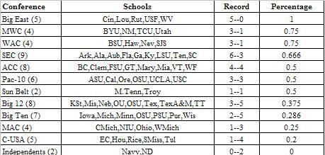 Excuse me but didn’t Big East unranked team South Florida beat #17 ranked powerhouse SEC team Auburn last week. And didn’t PAC 10 California Golden Bears humiliated then ranked # 15 Tennessee Vols on week 1. By calling West Virginia a high school team you are not fooling anybody but yourself. In the last two bowl game the mountaineers have beaten Georgia (2005) and Georgia Teach (2006) which included #2 NFL draft player Calvin Johnson. West Virginia Spread offense is one of the best and for your information even NFL team (Atlanta Falcons) visited mountaineers coach Rich Rodriguez to learn their offense. Coach Rich even decline a coaching job offer from SEC team Alabama last year. And Mr. College Football expert mampaka here is the college football bowl record by each conference last year. Funny to see high school conference is at #1 with 100% winning record and I’m sure in bowl game they don’t play their conference team. Conference Schools Record Percentage Big East (5) Cin,Lou,Rut,USF,WV 5-0 1.000 MWC (4) BYU,NM,TCU,Utah 3-1 .750 WAC (4) BSU,Haw,Nev,SJS 3-1 .750 SEC (9) Ark,Ala,Aub,Fla,Ga,Ky, LSU,Ten,SC 6-3 .666 ACC (8) BC,Clem,FSU,GT, Mary,Mia,VT,WF 4-4 .500 Pac-10 (6) ASU,Cal,Ore,OSU, UCLA,USC 3-3 .500 Sun Belt (2) M.Tenn,Troy 1-1 .500 Big 12 (8) KSt,Mis,Neb,OU, OSU,Tex,TexA&M,TT 3-5 .375 Big Ten (7) Iowa,Mich,Minn, OSU,PSU,Pur,Wis 2-5 .286 MAC (4) CMich,NIU,Ohio,WMich 1-3 .250 C-USA (5) EC,Hou,Rice,SMiss,Tul 1-4 .200 Independents (2) Navy,ND 0-2 .000