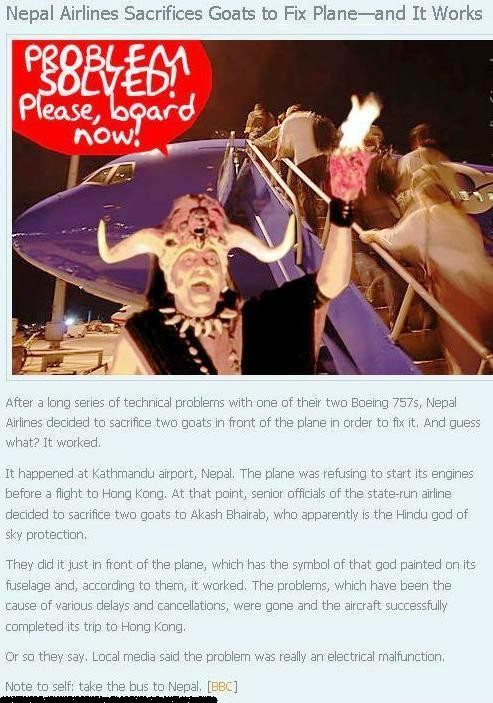 Walk the walk talk the talk : haha BUT JUST CAN"T READ AND ANALYZE hahaaha This proves you are dumb ass. Vegan for whole year re but oh wait doctor told you to quit being vegan bichara .Don't want to eat meat but just because doc said so. hahaha..keep it up!!good for you!! read carefully before then answer.Where is there a word i support sacrifice before mechanical fixes? You believe in non-sacrifice good for you but DON'T IMPOSE YOUR BELIEF ON OTHERS BELIEF.just like maoist. YOUR BELIEFS ARE YOURS, MY BELIEFS AND FAITH IS MINE !!!! WHY DO EVEN BIGGEST SCIENTIST AND ENGINEERS PARY BEFORE LAUNCH EVEN IN NASA.YOU THINK THEY ARE STUPID!AND YOU ARE THE ONLY SMART ONE OUT HERE DO YOU THINK ENGINEERS IN RNAC ARE STUPID , THEY ARE MORE AERONATUTICAL ENGINEERS FROM GOOD UNIVESITY AND I AM 100% SURE THEY KNOW SACRIFICING GOAT IS NOT GOING TO FIX THE MECHANICAL PROBLEMS!! YOU KNOW THER IS supernatural POWER UP THERE .EVEN THE MOST MECHANICALY SOUND BEST AIRLINES HAVE CRASHED IN SKY.SO, IT IS FAITH WE HUMAN BEING ARE NOTHING TO THIS POWER.IT IS OK IF YOU DON'T WANT TO BELIEVE BUT DON'T IMPOSE OTHERS!!!! All these smart people who are ashamed should be ashamed of corruption that grounded the plane first not after. joke to rest of world ..Yes it might be joke for others but faith for some!!!!Stop showing your religion is superior to mine or you are big animal right activist when you have frozen beef and bacon in your fidge!!!!! one more thing, i buy goat with my money , i will cut goat infront of my car .So , what's your problem? if American Airlines wants to cut goat infront of there planes who the f are you to stop them? i didn't try to cut goat infront of your car!!!! when there is jolt in the sky when you are flying who do you remember?GOD..have you seen God!!! IN GOD WE TRUST!!- and this is America!!!! i am sure you are not gonna get anything cause you are full of it!and you will come back with saying how dumb i Am ..haha keep living in your own world !!!Analysis and critical thinking is not for you. Be happy eating inhumanly slaughtered beef ..my buddist friend!!! AGAIN: "The whole thing should've been done away from the eyes of the media AND THE PASSENGERS" - WHAT A HYPOCRITE MORON SAJAH HAS EVER SEEN.THIS PROVES ME STRONG AGAIN THAT YOU ARE DUMB  no further dicussion required! whole sajah community must be laughing at you right now ..MR TALK THE TALK AND WALK THE WALK