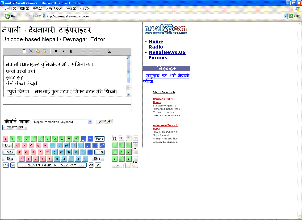 Yes, thanks to writer Kedar Sharma's encouragement, I too learnt to type in Nepali this past week-end in about an hour. Yes, that's true -- in about an hour. Was amazed by the experience. Did not know that Nepali typing in Unicode was/is so easy. I would recommend this to you all, if you don't know this nice little secret already. As they say, a good thing like this is to be shared widely. oohi ashu