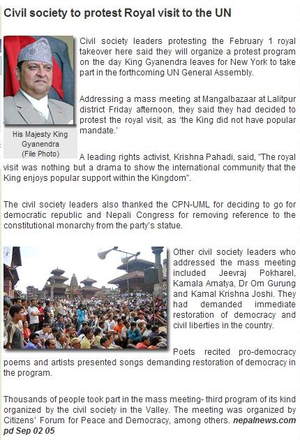 Nepal's Civil society to protest Royal visit to the UN - http://www.nepalnews.com/archive/2005/sep/sep02/news14.php
