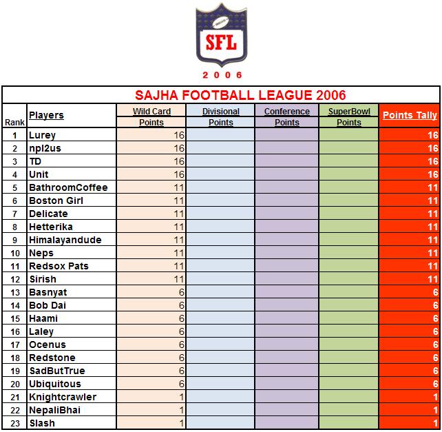 Hello Guys: First off all, thank you all for your active participation. For the playoffs, here's how I will tally the points. 4 points for each correct prediction, -1 for each incorrect prediction. I will keep a running Tally of points until the Superbowl, and then declare our SFL PLAYOFFS FOOTBALLER OF THE YEAR, much like Playoffs MVP (we already had our regular season MVP, aka SFL Footballer of the Year - DELICATE). Let me know if you guys have better suggestions. Here's where we all stand. Great week for some, and miserable for few like myself, who got burnt on the upset picks......
