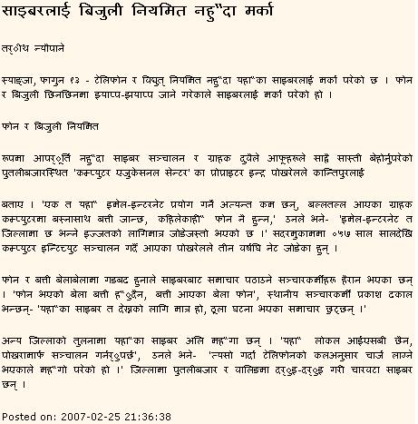 “साइबर” शब्द प्राय नेपाली इन्टरनेटका साइटहरुमा देखिरहन्छ । मलाइ यो शब्द सधै अपुरो लाग्थ्यो । तलको कान्तिपुर कटिगंमा पनि साइबर शब्द शिर्षकमा नै रहेछ। अब चाहि सारै झकझकायो मलाइ त्यो शब्दले । त्यस पछि यसको माने हेर्न आफु संग भएको पुरानो लंगमेन शब्दकोश पल्टाए । त्यसमा त यसको माने नै रहनेछ। ल भयो अब ? त्यसपछि मेरो कम्पिट्युरको कुनामा झुन्डिएको “ www.dictionary.com” को लिकंमा माउस थिचे । त्यसमा पनि साइबर शब्द “cybernetic” संग जोडिएको बाहेक केहि देखाएन । झन तेइ साइटको “Thesaurus”मा त साइबर शब्दनै छैन पो भन्छ । कस्तो शब्द कान्तिपुरले राखेछ, नेपाली त पक्कै होइन ? अब चाहि मलाइ पक्का भयो साइबर शब्द अपुरो नै हो । “साइबर” उपसर्ग बनेर “cybernetics “ मा आएको रहेछ जस्को माने हो “समाहिलिएको यन्त्र वा दिमागबाट बैज्ञानिक तरिकाले खबर आदान प्रदान हुनु (The scientific study of the way in which information is moved about and controlled in machines, the brain, and the nervous system.)” । तेही “cybernetics”बाट “cyberspace ” बनेछ जसको माने हो “सुसाकंकिय संजालमा बिध्धुतिय माध्यमबाट सिधा संबाद हुनु” (The electronic medium of computer networks, in which online communication takes place.)“। अब त प्रष्ट भयो साइबर शब्द होइन कि यो एउटा “उपसर्ग “ हो । भने पछि अब राम्रो संग अर्थिन माथिको कान्तिपुर मा “साइबर” सित “पसल” पनि जोड्नु पर्ने भयो । कसैले साइबर मात्र भन्छ भने पक्का पनि त्यो अपुरो शब्द भयो।