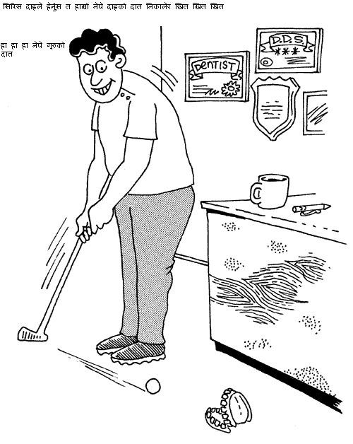 हा हा! ठूली, यो गल्फ खेलेको कार्टूनले त अत्ति हँसायो! 'हा हा हा! नेपे गुरूको दाँत' रे!