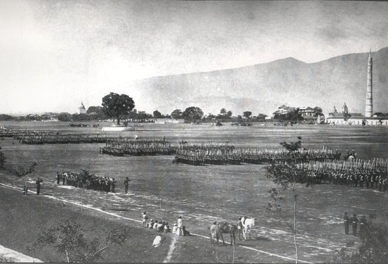 Tudikhel 130 years ago. Dharahara at that time had 11 stories.