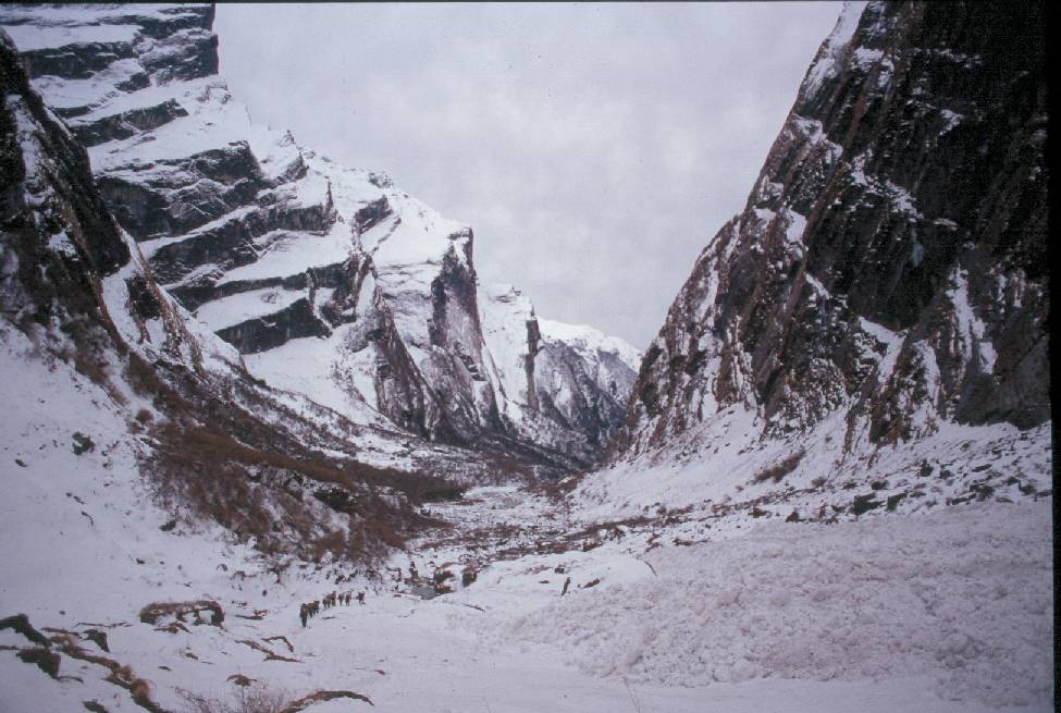 Looking down at Modi river gorge... Avalanche at right... This kind of passage is very risky as in case of avalanche, there is no way out....