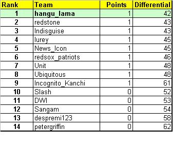 Result of Round III knock-out series: Week III (Divisional Championship) Redsox_Pats vs Slash .................. Redsox_Pats Hangu_lama vs Sangam ................ Hangu_lama Congrats to both Hangu and Redsox_Pats. You guys are the sole survivors for the SUPERBOWL. Good luck in the super bowl.