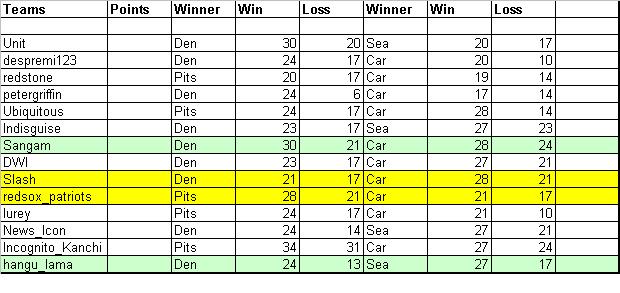 Okay Let's wrap it up now. The final is between Hangu_Lama and Slash. Also let's see who will be the Ultimate Winner . Who will have the closest prediction on the most important game of all...The superbowl!!!