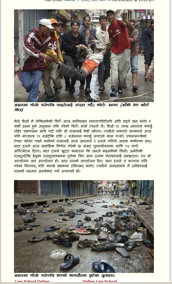 जनआन्दोलन-२ (चप्पलवालाहरुको क्रान्ति) फ्रिडम एट मिडनाइट डा. गोविन्दराज भट्टराई सिमालीझ्याङ् पुगेर हेर्यौं, युद्धमैदान चप्पलैचप्पलले भरिएको थियो- हरिया, राता, पहेंला, तुना चुँडिएका, भुक्के, प्लास्टिकका, केही सल थिए, पछ्यौरा थिए, जुत्ता पनि थिए, च्यातिएका इस्टकोट, सर्ट र सारी अनि रगतका छिर्का । उनीहरू अझै खेदिरहेका थिए । यसरी आङ्मा एक धरोमात्र भिरेका, जुत्ता किनेर लाउन नसक्ने पनि तीन हप्तादेखि दिनैपिच्छे भोकैतिर्खै आहुती बनिरहेका थिए । कसरी यस्तो हुन सक्छ ? - http://www.kantipuronline.com/kolnepalinews.php?nid=72898 ************ *********** ************ पाठक मञ्च गरिबलाई नबिर्सौं जगत देउजा जनआन्दोलनमा सबै तह र तप्काका व्यक्ति तथा संगठन सहभागी भए पनि गरिब तथा श्रमिकहरूको सानदार उपस्थितिलाई धेरैले अर्थपूर्ण मानेका छन् । आन्दोलनमा अधिकांश चप्पल लाउनेहरू सरिक थिए । - http://www.kantipuronline.com/kolnepalinews.php?nid=73093 ************ *********** ************ असनबाट: