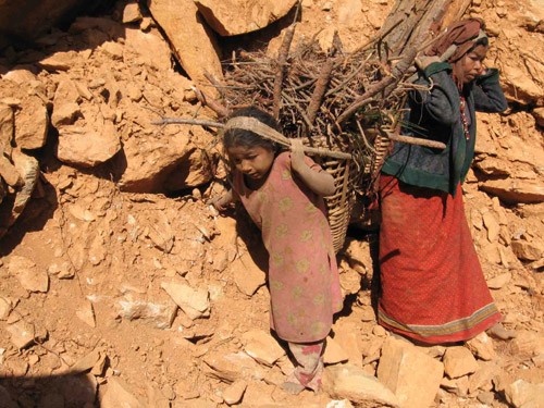A girl child collects firewood at Kholma VDC, Ramechhap district. Children are often used for such manual labour in the district. (Photo : Tika Bhatta )