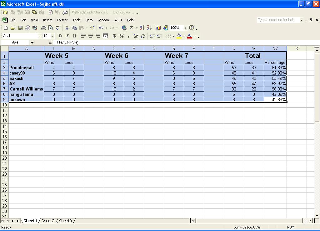 Arizona at Buffalo - win Arizona OKAY, here is mine Baltimore at Philadelphia - Philly make it 7-0 whoohoo Cincinnati at Tennessee - Tennessee Detroit at Dallas - Detroit Green Bay at Washington - ahaha, i laugh at redskins already, go GB Indianapolis at Kansas - Kansas goin down baby, go indianapolis Jacksonville at Houston - this game is gonna suck! i bet for houston! N.Y. Giants at Minnesota - Giants of course Atlanta at Denver - Atlanta Carolina at Seattle - Seattle New England at Pittsburgh - Steelers suck, i used to like'em! but with NE, they're gonna make 7-0 Oakland at San Diego - San Diego! sapp aint helping San Francisco at Chicago - Chicago Monday, Nov. 1 Miami at N.Y. Jets - go jets, make it 6-1