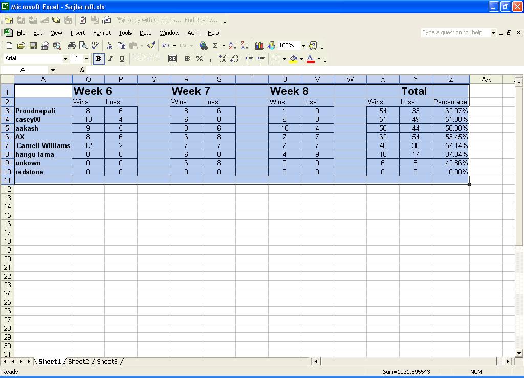 week 8 results ...... great job by aakash bro. he got 10 right. e bru welcome... make sure you predict before the game not after ;) finally good to see bill parcel's team winning. texan with QB was a surprise. Finally PATS went down :) Is Steelers that good??? We will know this weekend, since they will be playing another unbeaten team, Philly ............ proud bro still leading with 62% go HUSKERS go :p