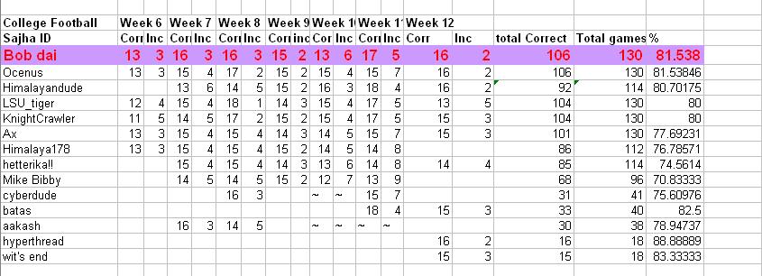 #2 Michigan at #1 Ohio State---------->Michigan Western Carolina at #3 Florida---------->Florida #17 California at #4 USC---------------->USC #5 Arkansas at Mississippi State-------->Mississipi State ( Upset of the week..what the hell??? Army at #6 Notre Dame ----------------->Notre Dame #7 Rutgers at Cincinnati ----------------->Rutgers #8 West Virginia at Pittsburgh---------->West Virginia Mississippi at #9 LSU--------------------->LSU(GOOO TIGERSSSS!!!!!!!) South Florida at #10 Louisville--------->Louisville Buffalo at #12 Wisconsin---------------->Wisconsin Utah State at #13 Boise State----------->Boise State #19 VTech at #14 Wake Forest--------->Wake Forest #15 Auburn at Alabama------------------>Alabama(Another upset..what the hell) #16 Oklahoma at Baylor----------------->Oklahoma Duke at #18 Georgia Tech--------------->Georgia Tech #21 Maryland at #20 Boston College-->Boston College #22 Tennessee at Vanderbilt------------>Tennessee New Mexico at #23 BYU ------------------>BYU