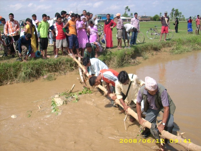 As the mahendra highway is sweptaway, people negotiate a swollen khola..........