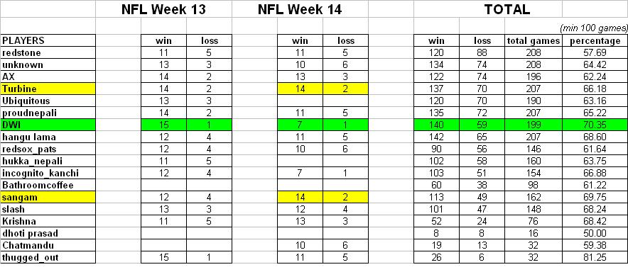 here's the week 14 results... DWI still leads the league.. congtraz to sangam and turbine for the win...